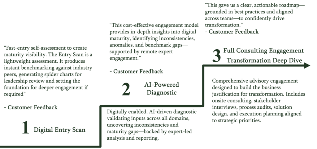 An expert-led, remote diagnostic that dives deeper into data inconsistencies, maturity gaps, and benchmarking insights—without requiring full onsite effort. - Step 3: Full Consulting Engagement